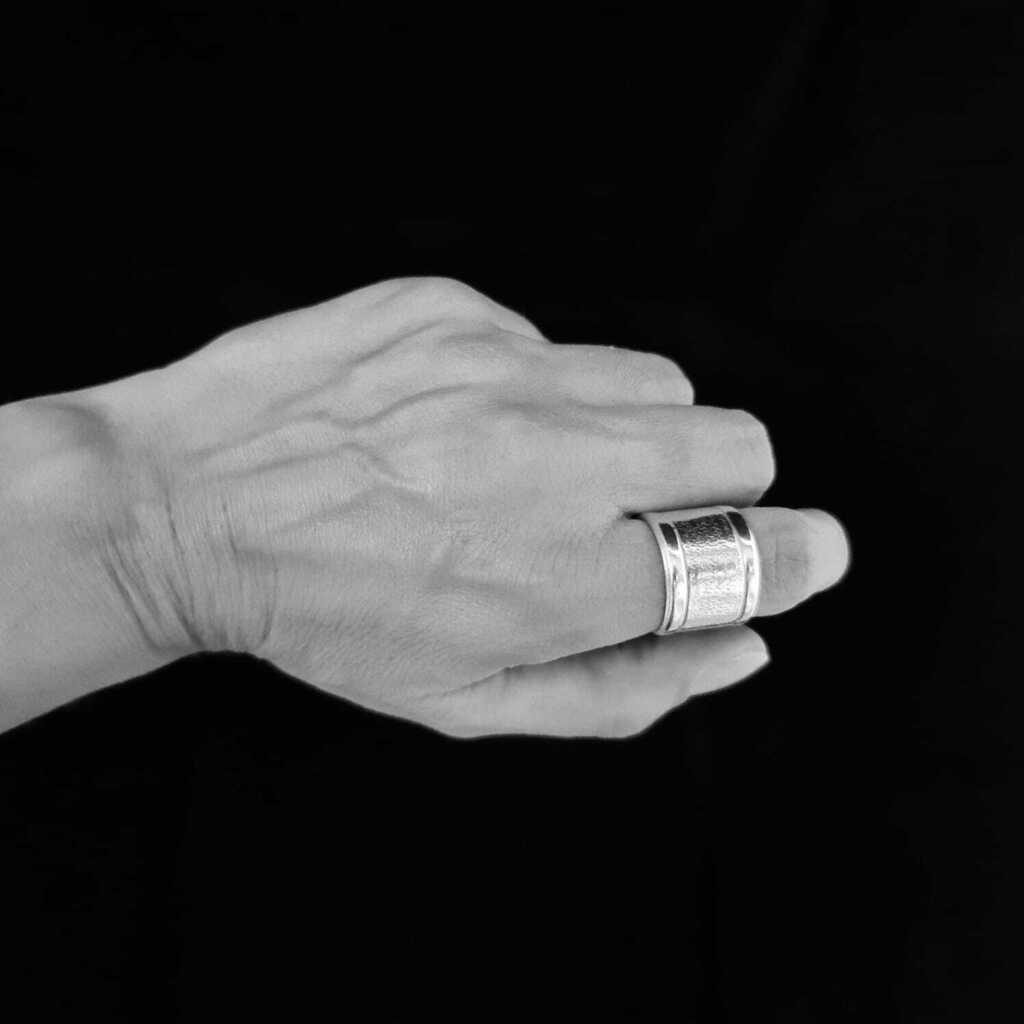 Anillo martillado con sutil línea cincelada de 1,5 cm de ancho. Alianza abierta para poder regular su medida. Pieza bañada en plata. Diseñada y fabricada en Argentina.