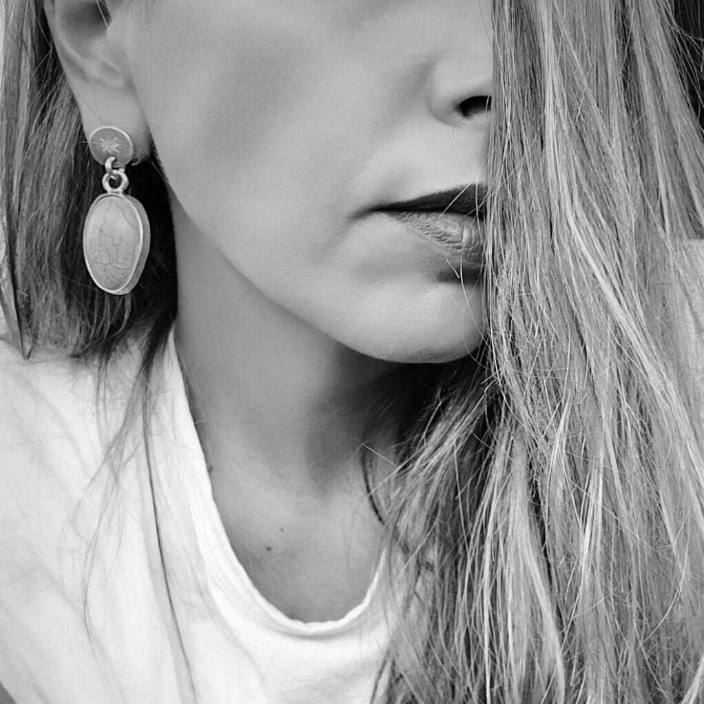 Par de aros medianos con lóbulo Mestiza y piedra oval reconstituida engarzada. Largo total de 4,5cm. Pieza bañada en plata. Fabricada y diseñada en Argentina.