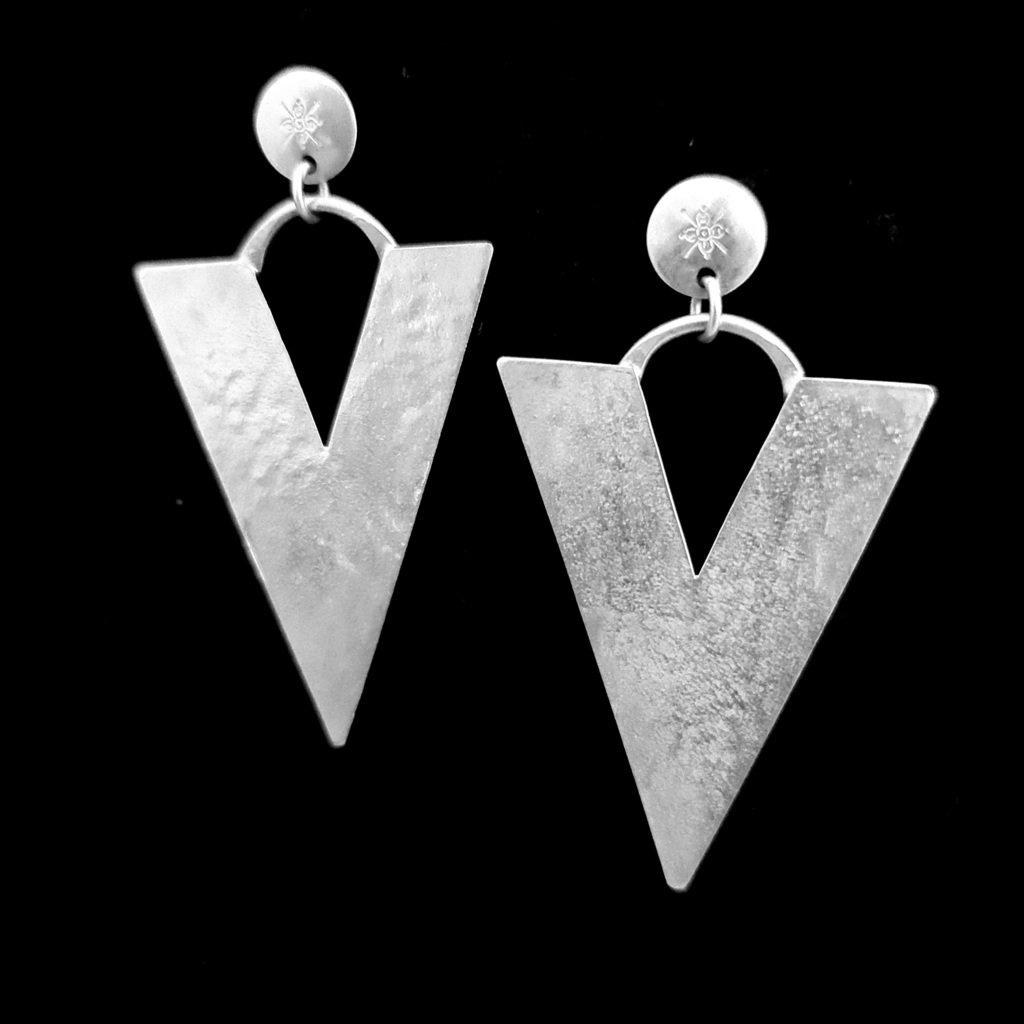 Par de aros medianos en forma de triángulo y lóbulo con logo Mestiza. Largo total de 8 cm. Ancho de 4 cm. Pieza bañada en plata. Diseñados y fabricados en Argentina.