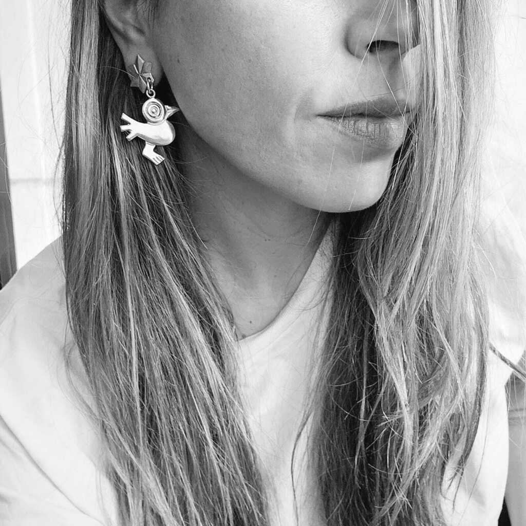 Par de aros medianos con lóbulo de estrella trabajada en alto y bajo relieve y colgante de ave cincelada. Largo total de 4cm. Pieza bañada en plata. Fabricados en Argentina.