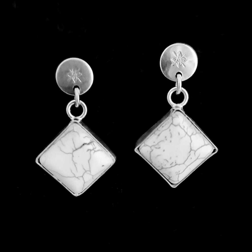 Para de aros medianos con lóbulo y piedra cuadrada cincelada de 2 cm. Largo total 4 cm. Pieza bañada en plata. Fabricados y diseñados en Argentina.