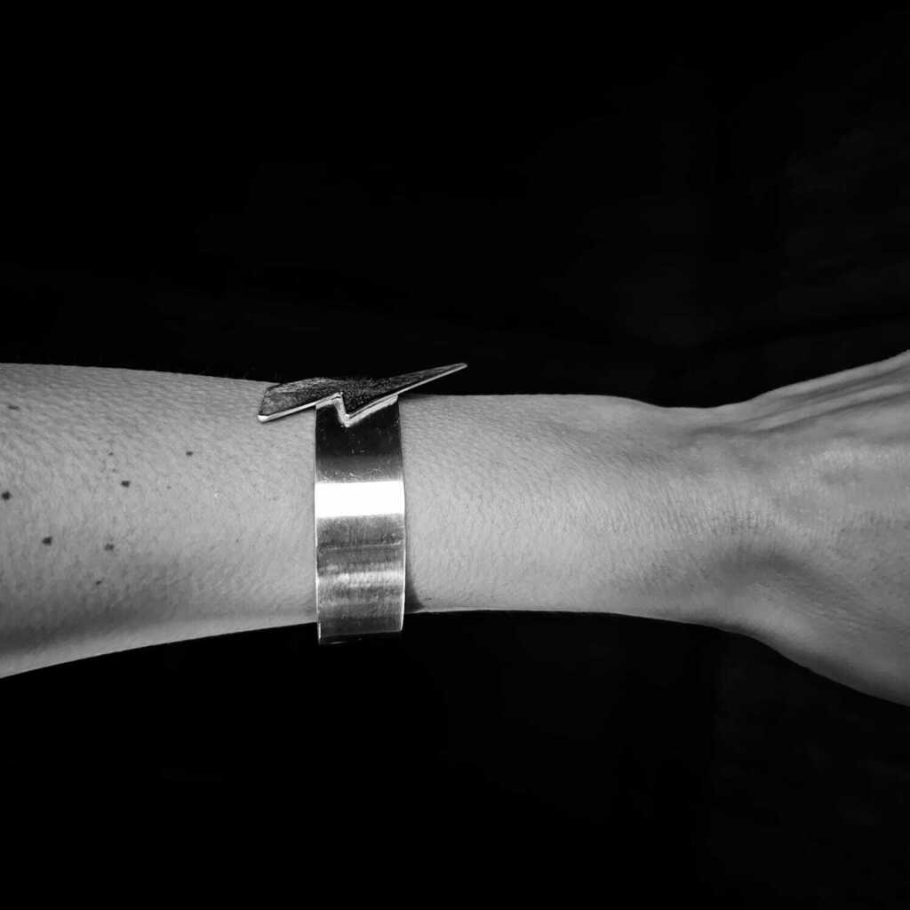 Especial esclava con aplique de rayo martillado de 4,5 cm. Esclava abierta para poder regular su medida. Pieza bañada en plata. Fabricada y diseñada en Argentina.