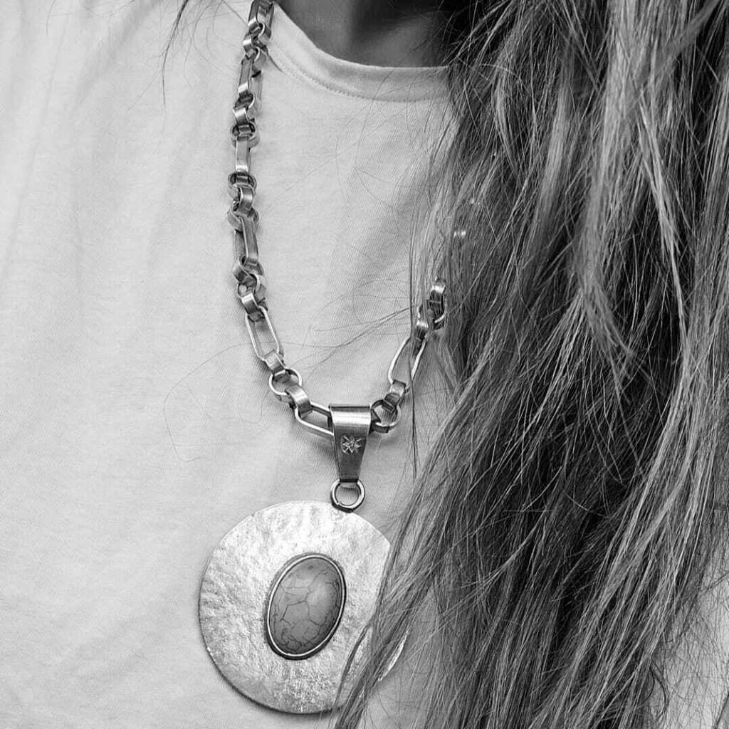 Collar compuesto por cadena realizada a mano de 63 cm de largo y dije circular martillado con centro de piedra reconstituida color turquesa. Diámetro del dije 6 cm. Pieza bañada en plata. Fabricado y diseñado en Argentina.
