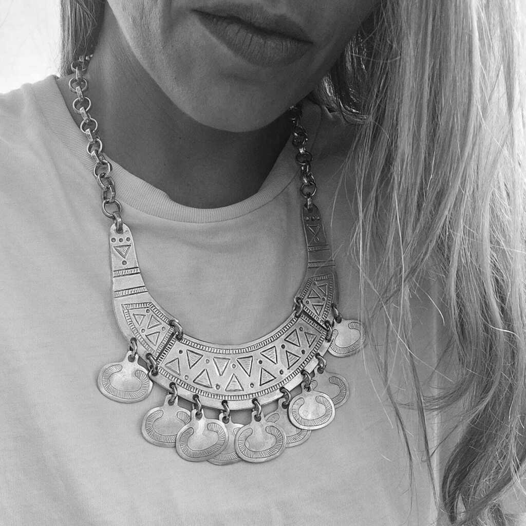 Collar tipo pectoral trabajado en alto y bajo relieve y lagrimitas mapuches colgantes. Largo de 45 cm. Pieza bañada en plata. La linea Huella Andina nos transporta a la simpleza y majestuosidad de los Andes. A sus pueblos que nacieron al amparo de sus laderas y su convivencia en un entorno imponente. Diseñado y fabricado en Argentina.