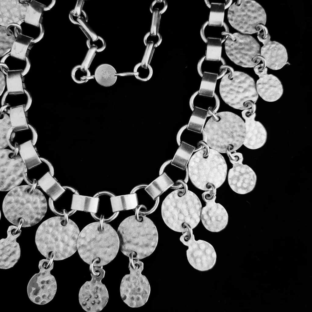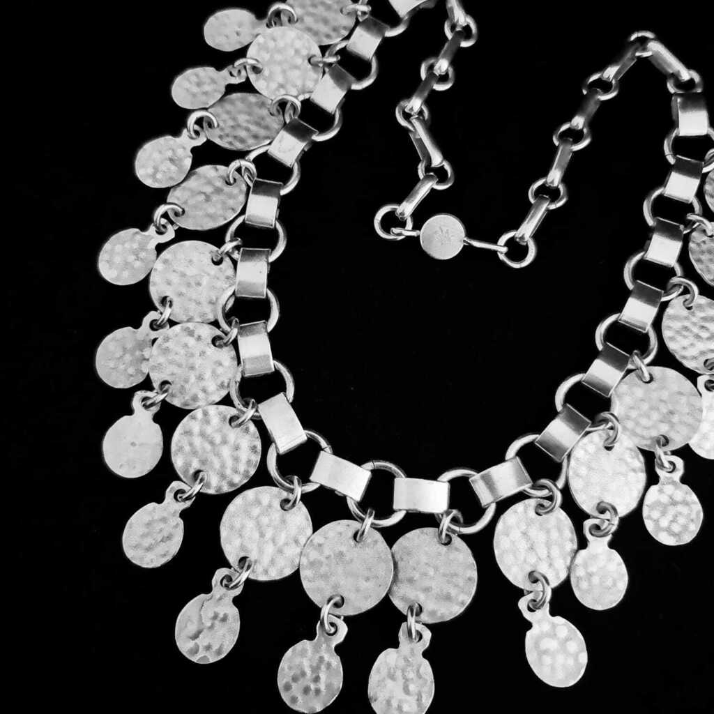 Especial collar tipo pectoral con cadena de media caña de 60 cm de largo y colgantes circulares y lagrimitas mapuches martilladas. Pieza bañada en plata. Fabricado y diseñado en Argentina.