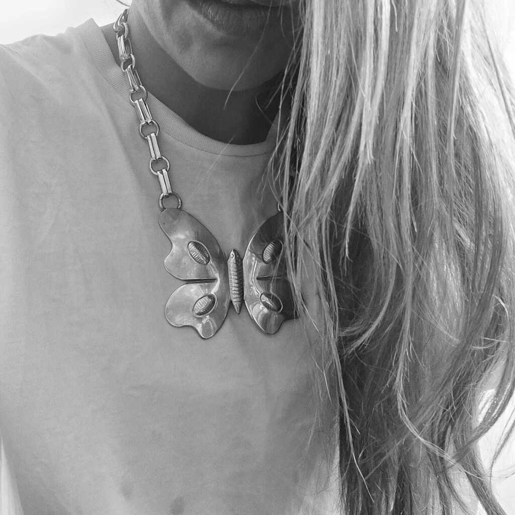 Collar de cadena eslabonada doble regulable de 45cm de largo acompañado de gran dije de mariposa trabajada a cincel. La linea Mariposa nos invita a una promesa de evolución y cambio permanente. Toda una metamorfosis para ser mejores. Pieza bañada en plata. Diseñado y fabricado en Argentina.