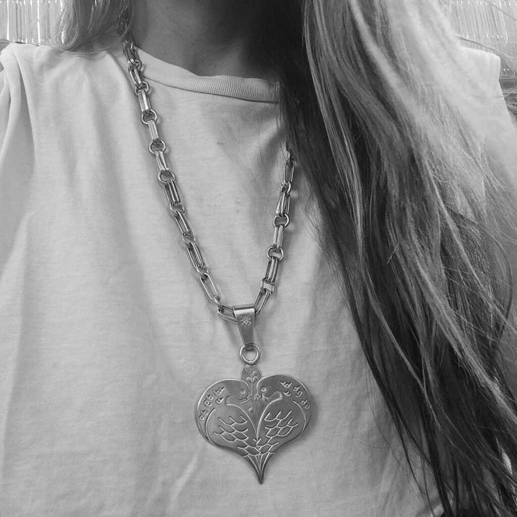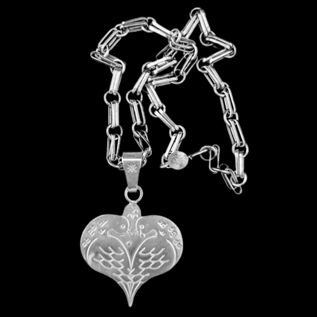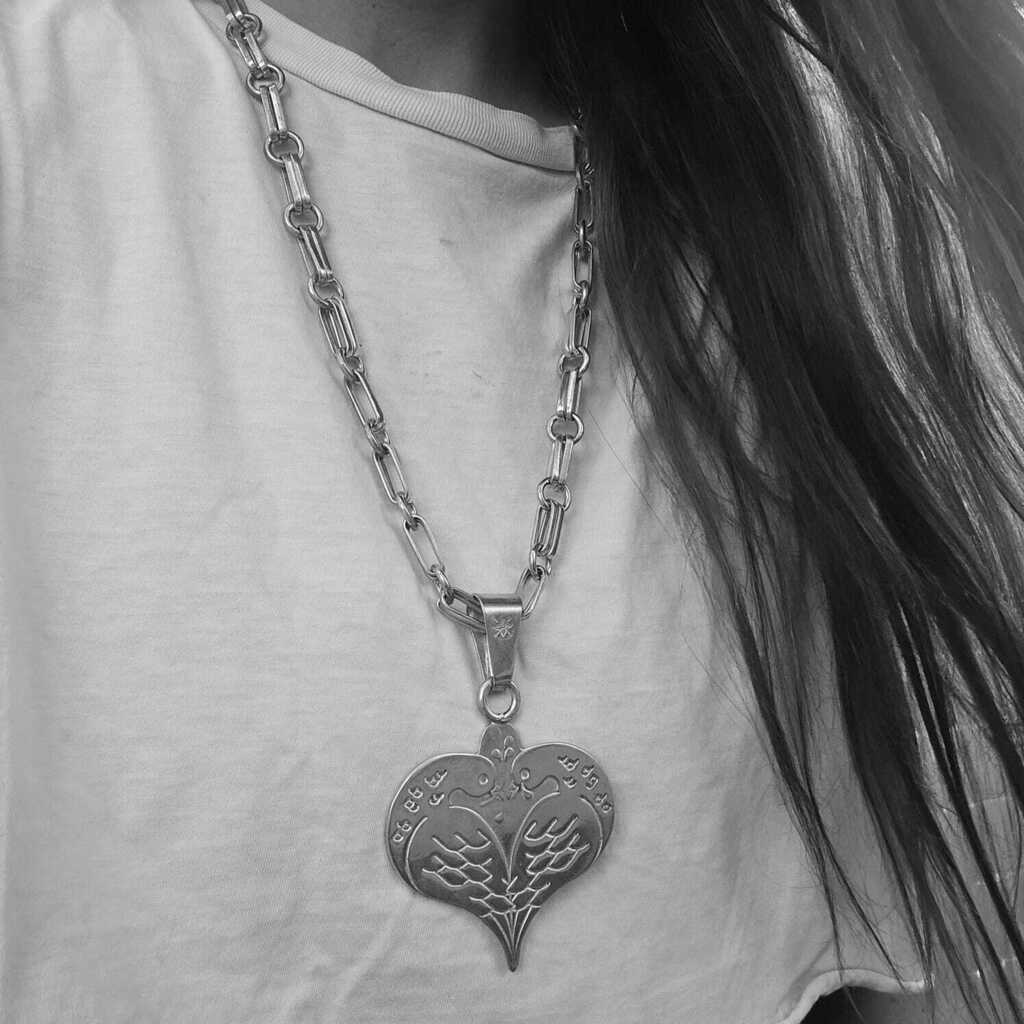 Collar compuesto por cadena realizada a mano de 50 cm de largo y dije de aves cinceladas de 6 cm x 6 cm. Pieza bañada en plata.. Sapucai: Grito de guerra largo o agudo, signo de júblilo. Fabricado y diseño en Argentina.