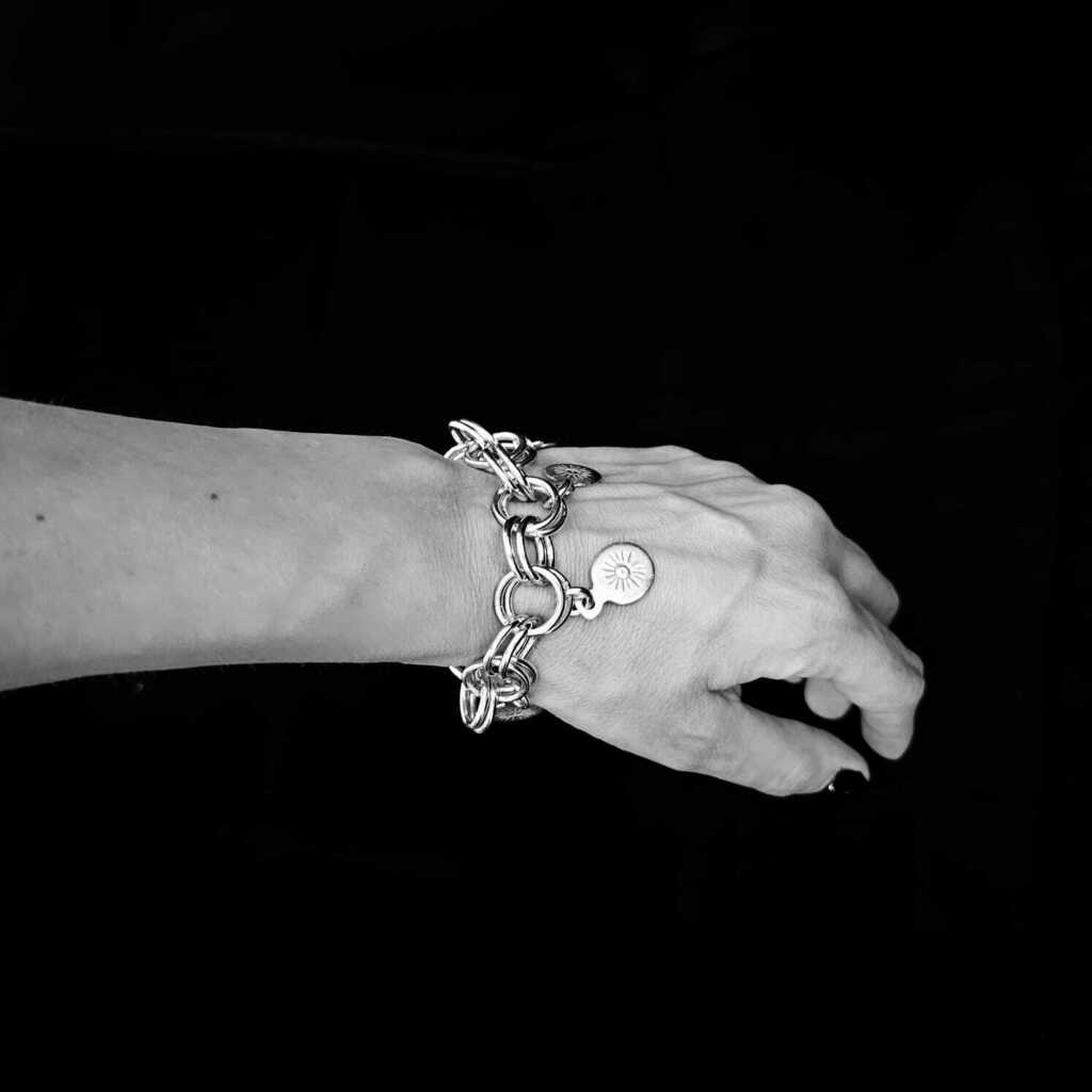 Especial pulsera articular realizada a mano de 23 cm de largo y dijes de lagrimitas mapuches colgantes. Pieza bañada en plata. Fabricada y diseñada en Argentina.