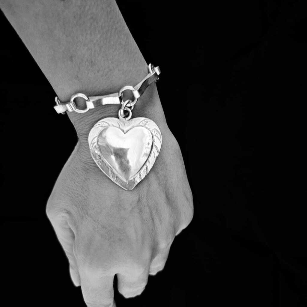 Pulsera con cadena de 23 cm realizada a mano y especial dije de corazón de 4 cm. Pieza bañada en plata. Fabricada y diseñada en Argentina.