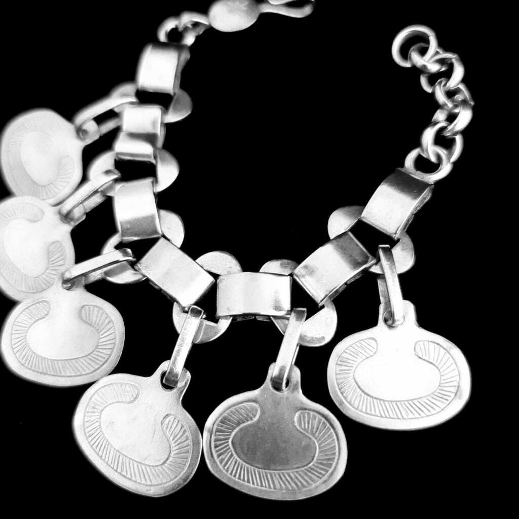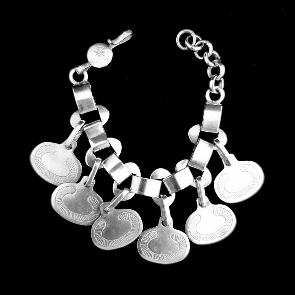 Pulsera articulada de media caña con lagrimitas mapuches cinceladas.Largo de 23 cm. Pieza bañada en plata. Fabricada y diseñada en Argentina.